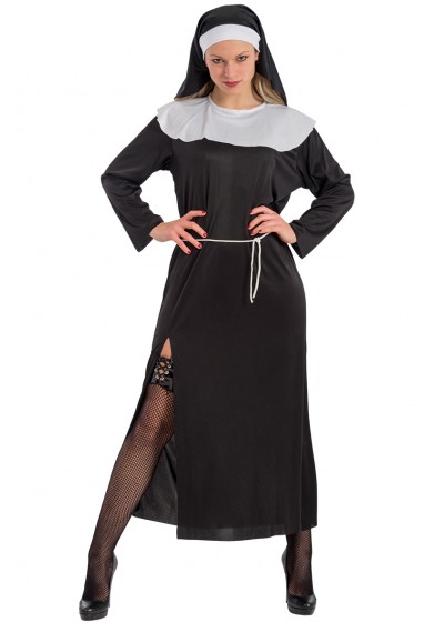 Κοστούμι καλόγριας, ενηλίκων one size (ML), από μαύρο ζέρσεϊ με κορδόνι στη μέση και σκίσιμο στο πλάι και μαύρο πέπλο με άσπρη ταινία.