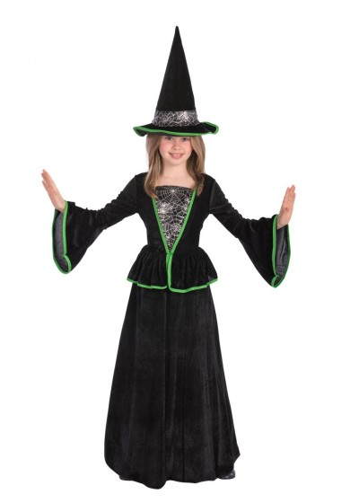 Βελούδινη στολή μάγισσας. Περιλαμβάνει φόρεμα με φαρδιά μανίκια και μακριά μαύρη βελούδινη φούστα και μαύρο καπέλο μάγισσας.